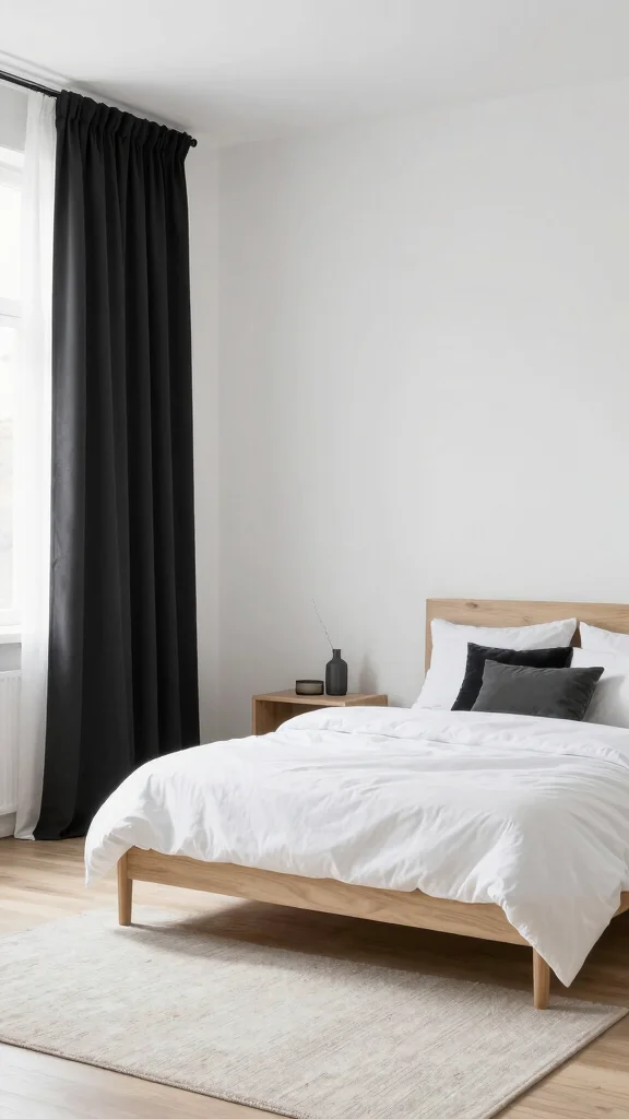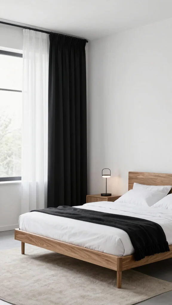How can I pair black and white curtains with other décor elements to keep a cohesive minimalist bedroom?