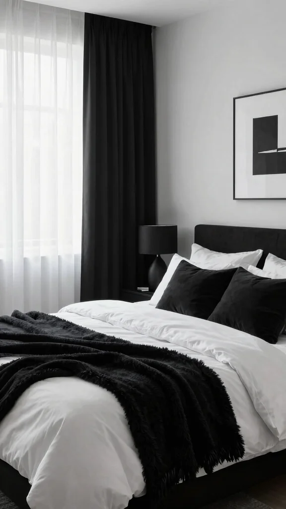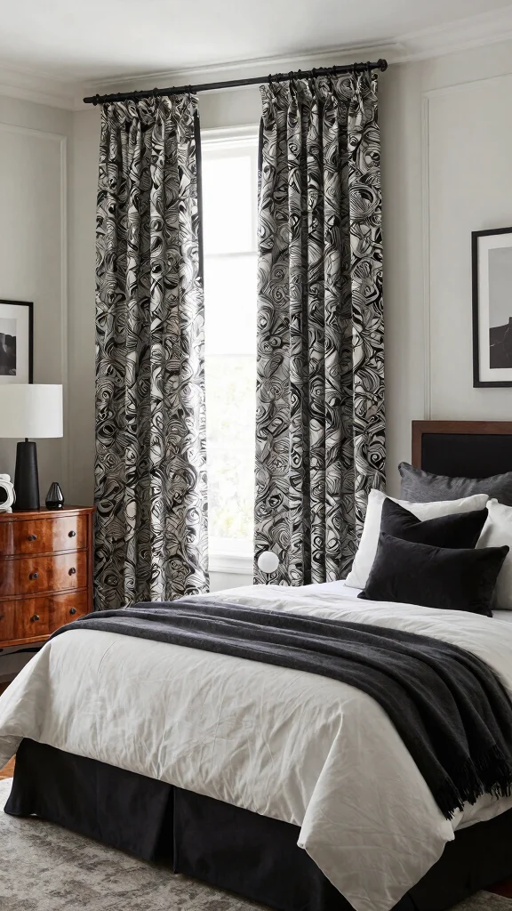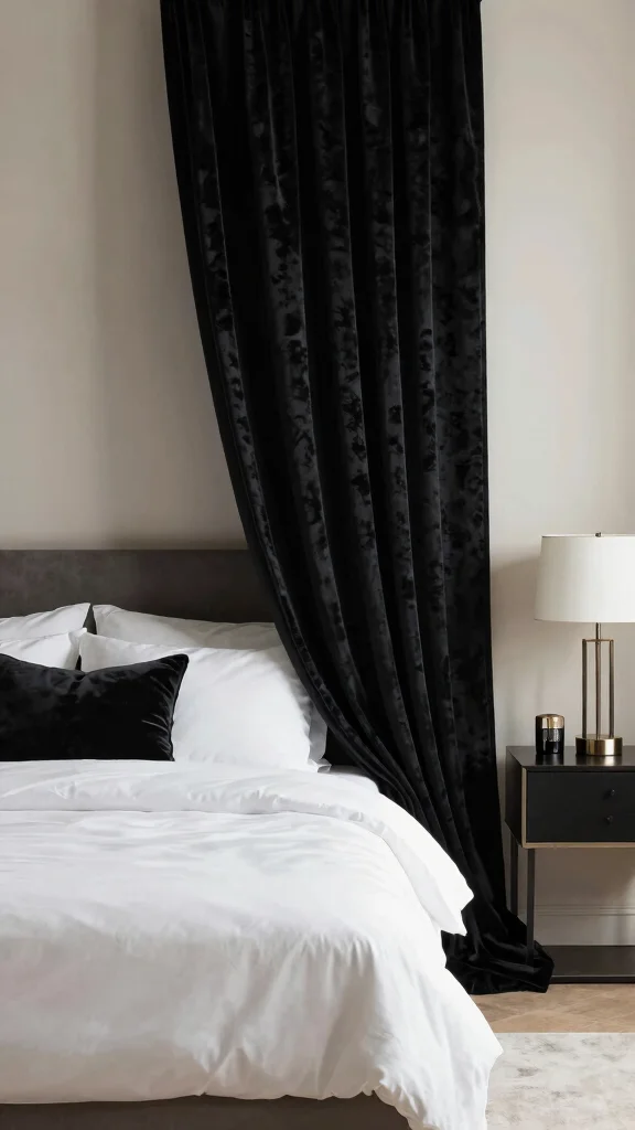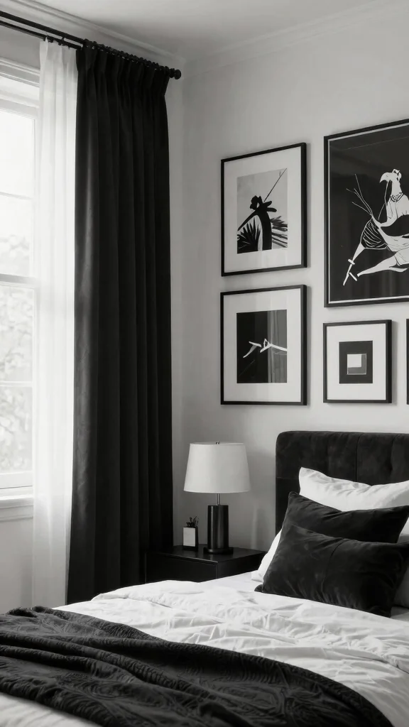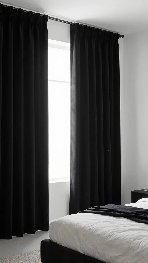 For those who prioritize sleep and privacy, dramatic blackout curtains are essential for your black and white bedroom decor. These curtains effectively block out light while adding a bold element to the space. Choose rich black fabrics that create a striking contrast against lighter walls or furnishings, enhancing the overall aesthetic.