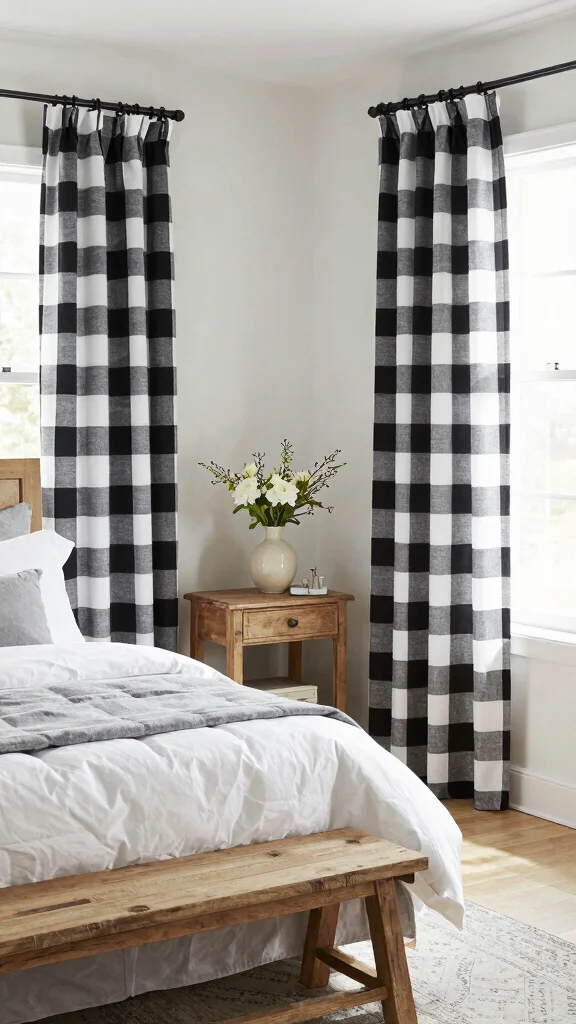 Consider a modern farmhouse theme by pairing black and white curtains with rustic decor elements for a cozy feel.