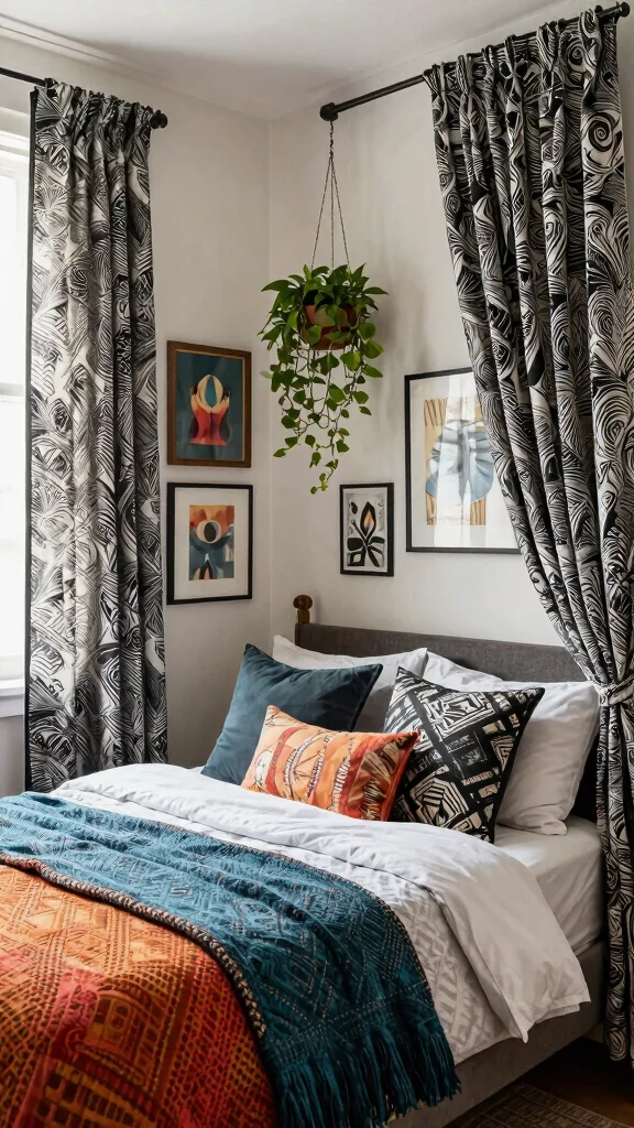 Start with a neutral base—white walls or soft gray bedding—and let the curtains do the talking.