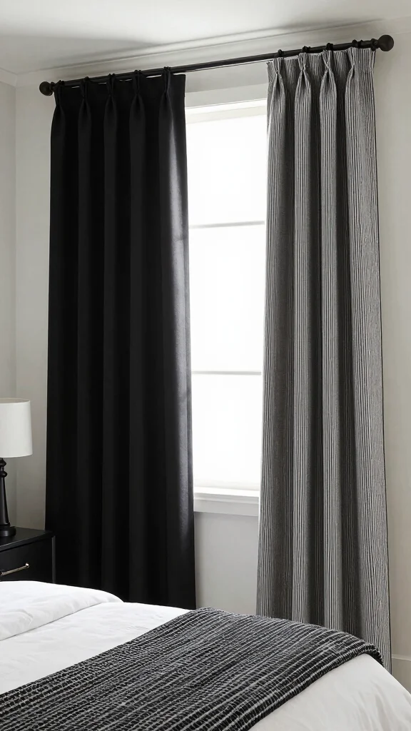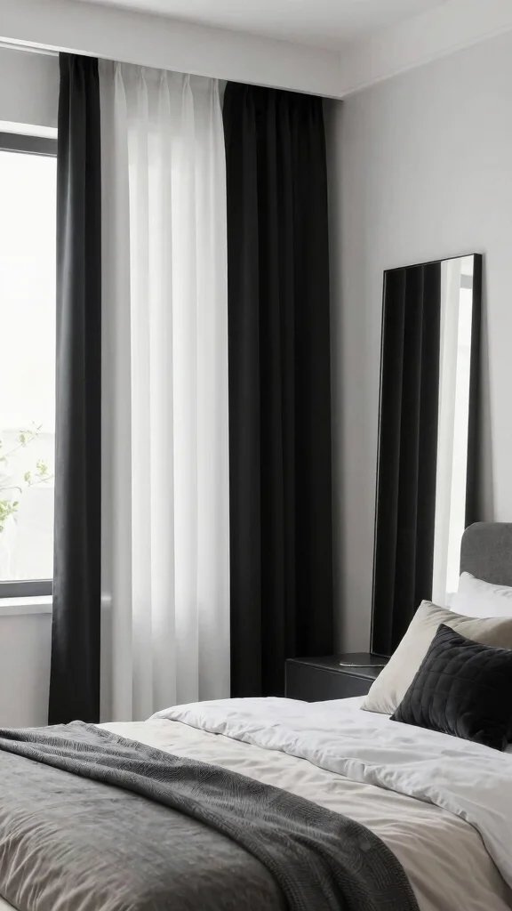 Layering textures with your black and white curtains adds depth and visual intrigue to your bedroom. Mixing materials like linen, velvet, and cotton creates richness that enhances the overall aesthetic. Consider layering sheer white curtains beneath heavier black velvet drapes to achieve a dramatic yet sophisticated effect.