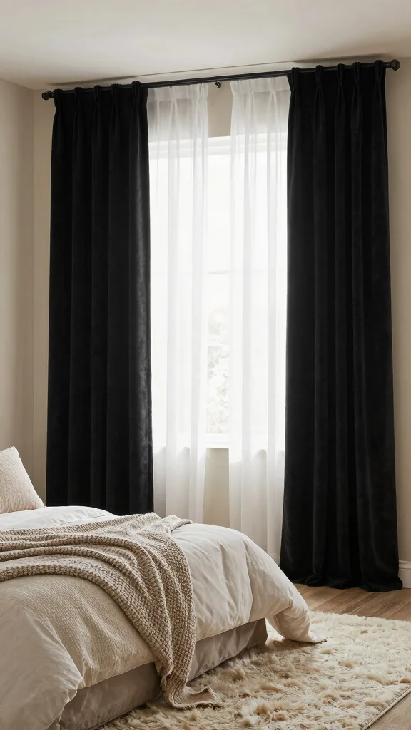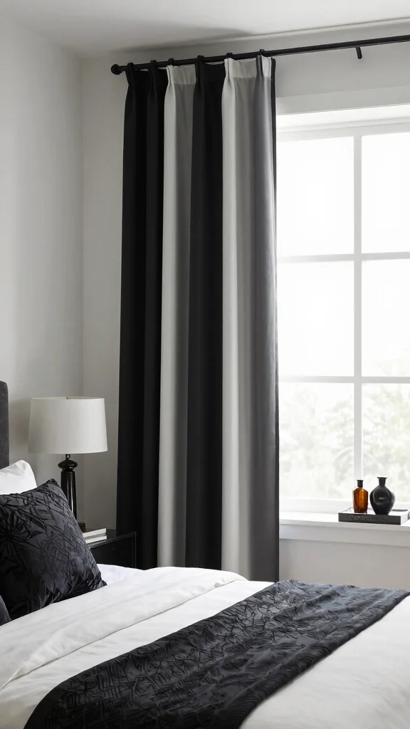 Layer black and white curtains with other window treatments to enhance privacy and light control while adding visual complexity.