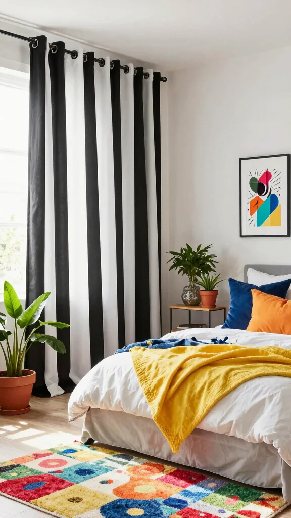 Incorporate colorful accessories or artwork against black and white curtains to create vibrant contrast and visual appeal.