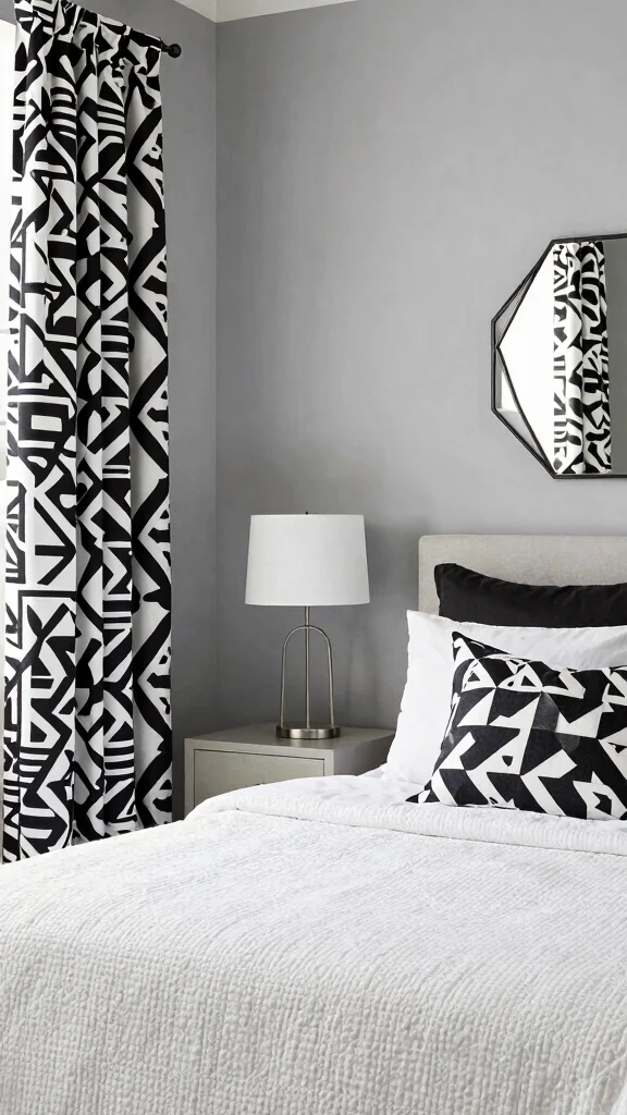 If your curtains are bold, balance with minimal bedding and furniture, and bring in texture with a rug or throw to enhance monochrome home accents without clutter.