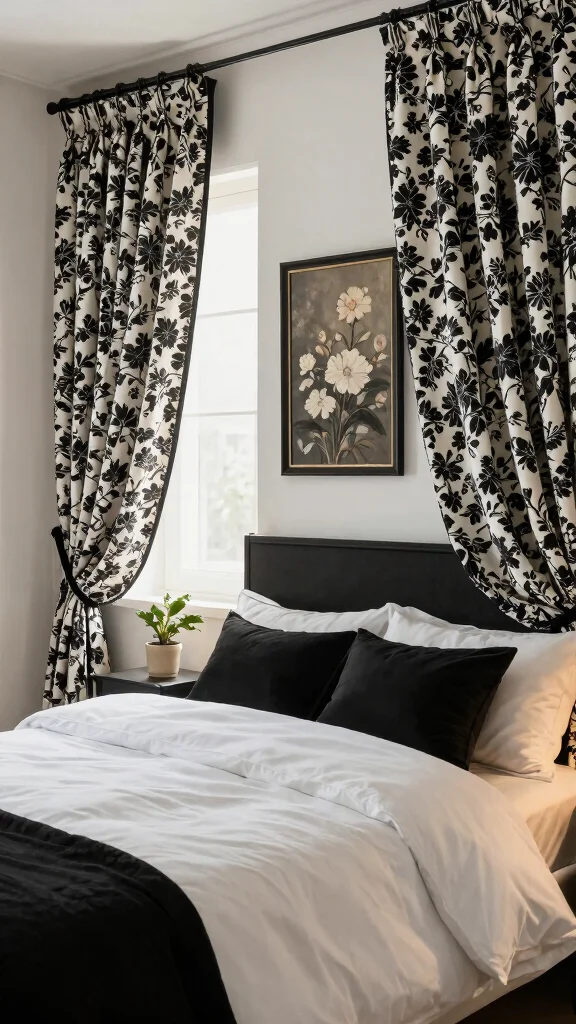 Floral accents can beautifully soften the starkness of black and white curtains while maintaining a contemporary vibe. Opt for curtains featuring delicate floral motifs, either in black on a white background or vice versa, to introduce a touch of charm and elegance. This subtle interplay enhances the overall design, making your bedroom feel inviting and sophisticated.