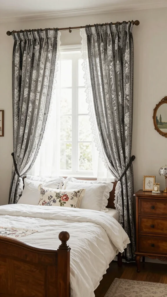 Infusing vintage charm into your bedroom with black and white curtains can create a nostalgic yet modern atmosphere. Choose curtains with delicate lace or antique patterns that evoke warmth and comfort while maintaining a stylish edge. Pair these curtains with vintage furniture pieces, such as an ornate bed frame or an antique dresser, to enhance the cohesive theme.