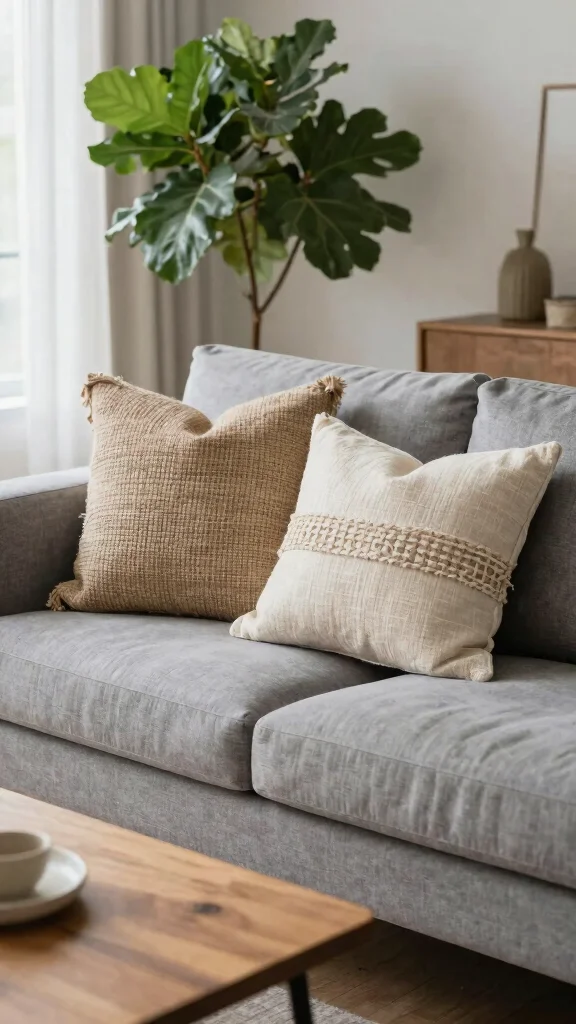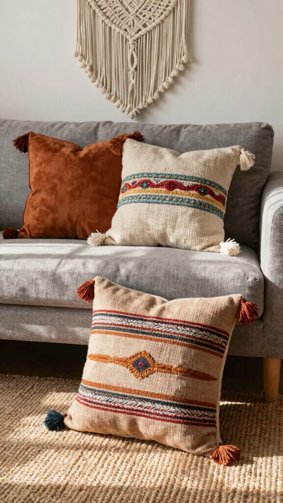 Styling a gray couch throw pillows with a bohemian vibe starts with a cohesive color palette of warm neutrals (ivory, taupe, terracotta) and muted greens. Mix textures like linen, velvet, and crochet to add depth, and pair throw pillow ideas that blend patterns with solids. For placement, use two larger pillows (20-24 inches) at the back and layer smaller sizes (16-18 inches) in front, then tuck in fringe accents for a true Boho feel. Finish with a few home accessories and you’ll elevate living room decor while nailing gray couch styling.