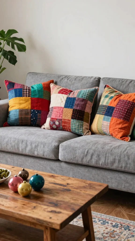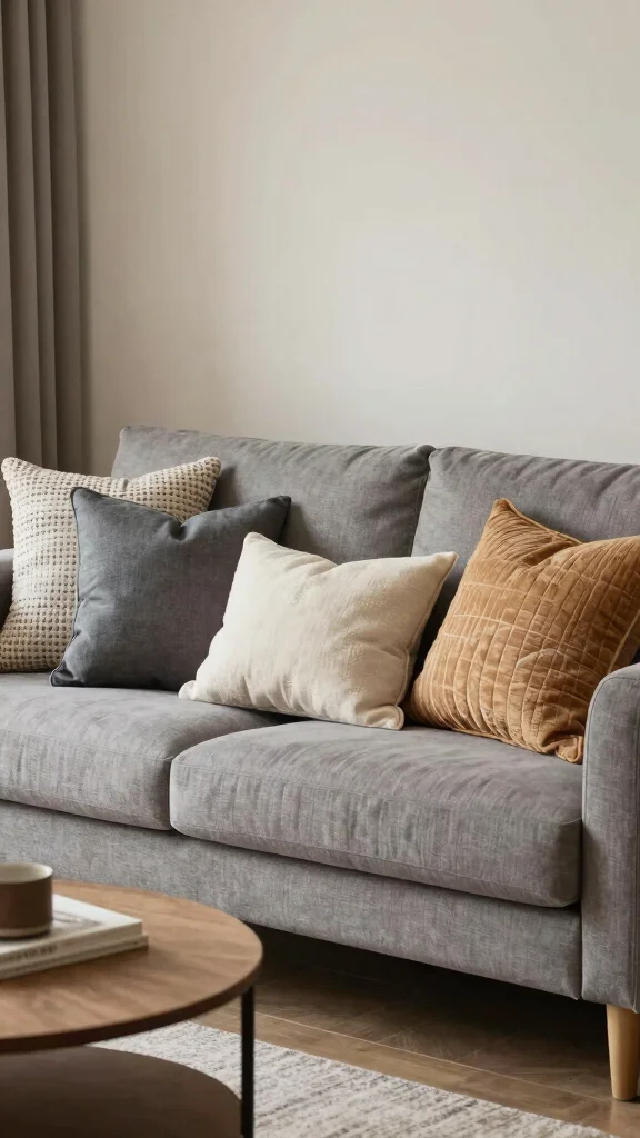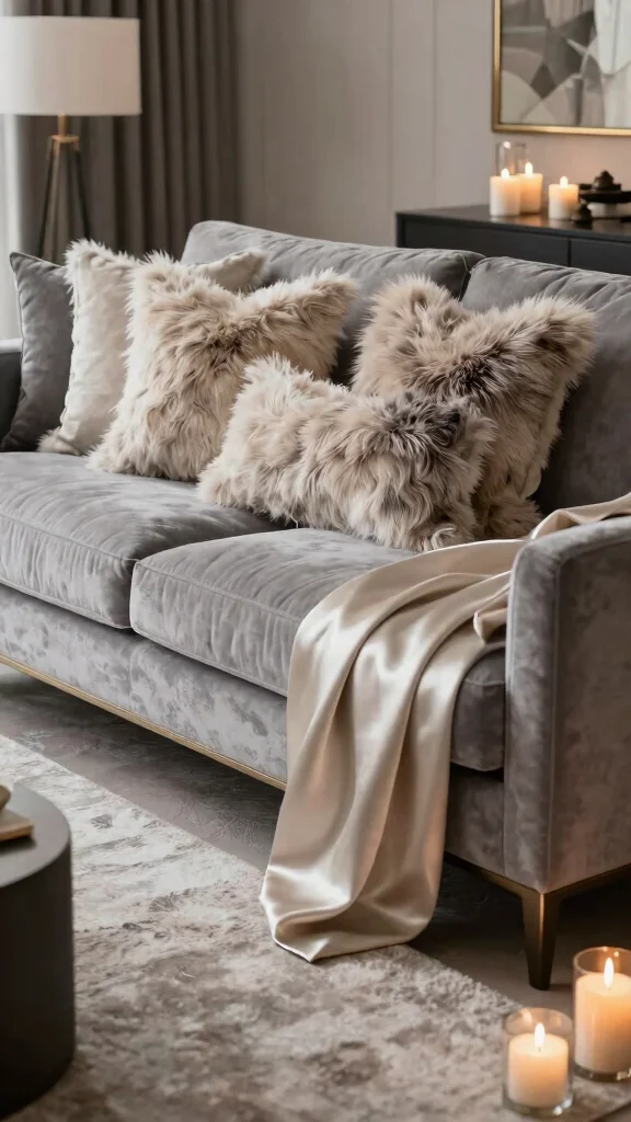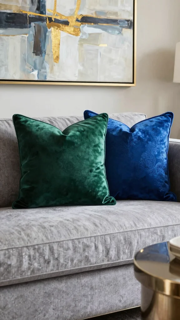 Fun fact: Velvet accent pillows on a gray couch can elevate coziness by up to 40% thanks to that lush texture. Emerald, royal blue, or burgundy create striking contrast, and a touch of gold or silver seals the glam.