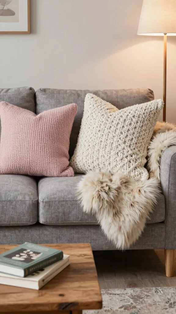 Incorporate textured knit pillows for warmth and comfort, enhancing the inviting atmosphere of your living room.