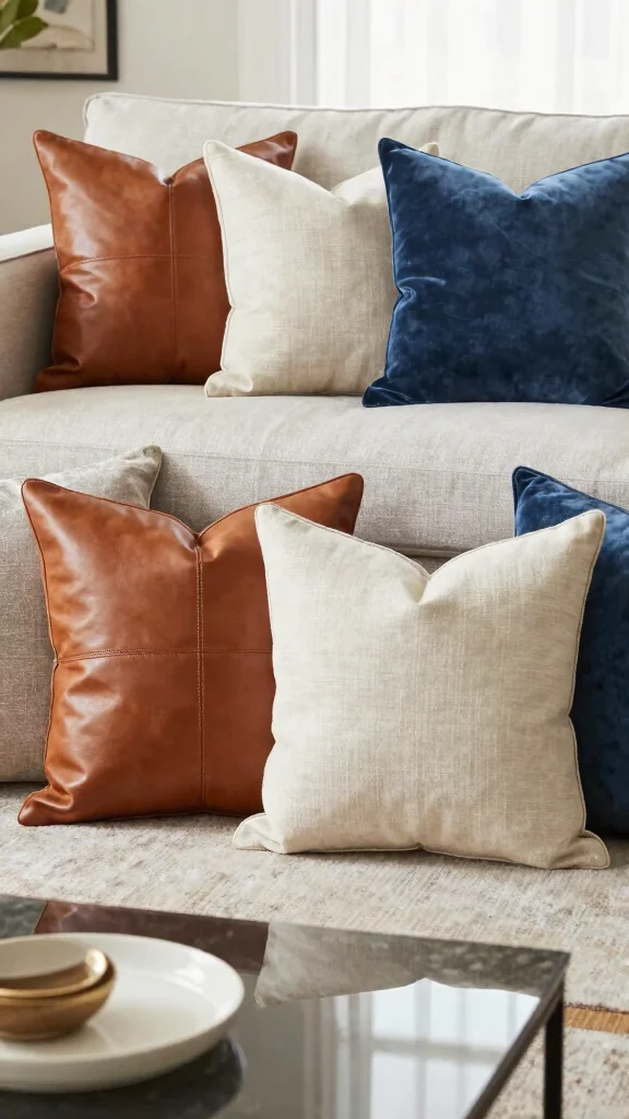 Mix textures: a supple leather pillow with a soft linen or wool pillow adds depth to your couch styling ideas. Use sizes like 18×18, 20×20, and 22×22 for a layered look: place two main pillows at the ends and a smaller lumbar in the middle.