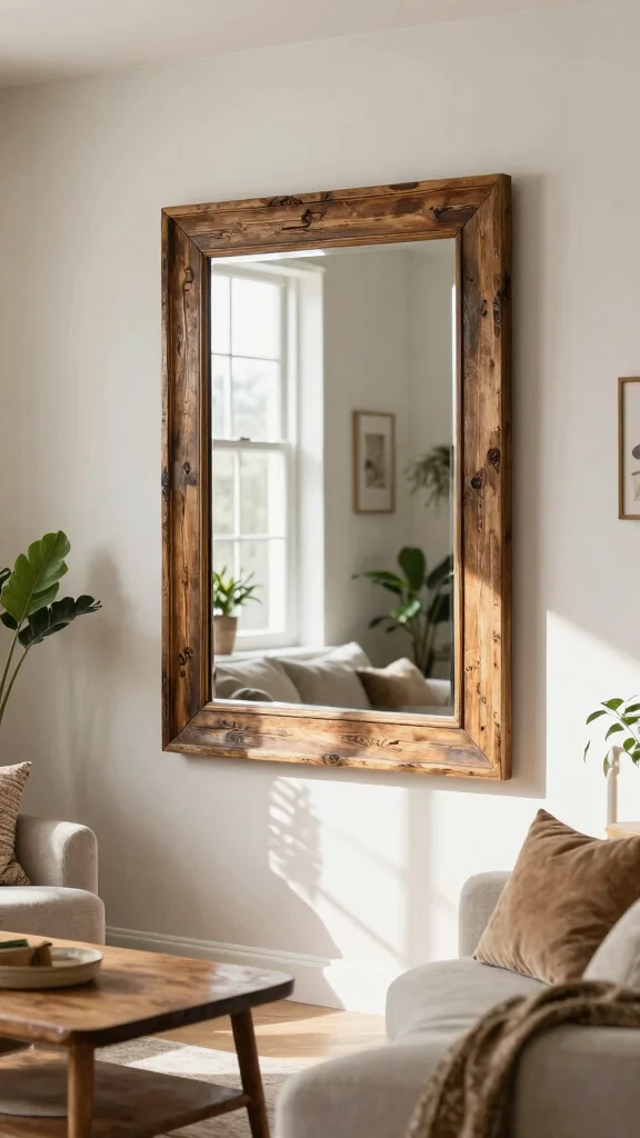 Bold mirrors, mindful frames. When you place a large decorative mirror with a reclaimed-wood frame, you amplify natural light and elevate living room wall decor ideas mirrors—efficient, stylish, and eco-friendly.