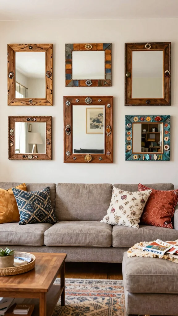 Design an eclectic gallery wall using various mirror sizes and styles for a unique and artistic vibe.