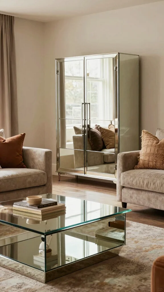 Mirrored furniture enriches your living room, adding depth and elegance while keeping it inviting.