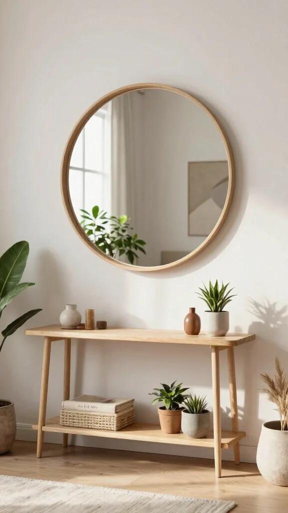 Round mirrors help balance hard edges, fostering a soothing and welcoming living environment.