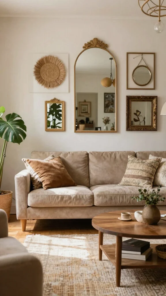 Fun fact: Vintage mirrors can cut decorating waste by up to 60%. When used in living room wall decor ideas mirrors, you mix Victorian and Mid-Century pieces—boosting light, reducing new-material demand, and keeping sustainability stylish.