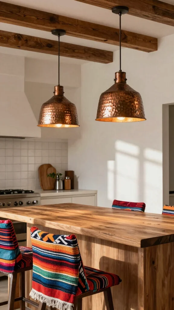 Rustic Pendant Lights Hammered metal, glass Earthy hues, Native motifs Cluster above dining area