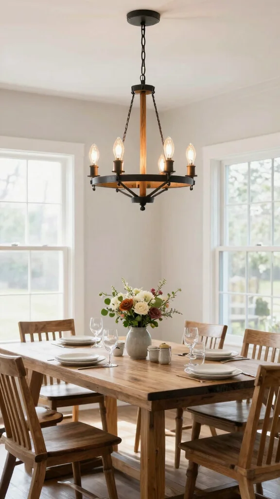 Opt for rustic wrought iron or farmhouse style chandeliers to create a warm, inviting atmosphere in your space.