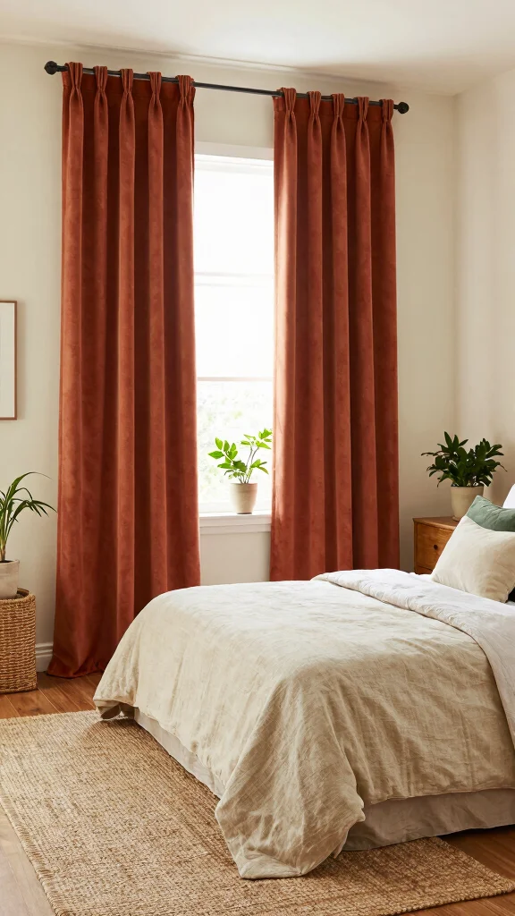 Earthy-toned velvet curtains beautifully embody the connection to nature, enhancing your bedroom’s warmth and comfort. Shades like terracotta, olive green, and mustard yellow create a grounded atmosphere that resonates with the natural world. Pairing these colors with wooden furniture or indoor plants enriches the eco-friendly vibe. Opting for earth-toned velvet ensures your decor feels luxurious while promoting sustainability. This thoughtful selection allows you to bring nature indoors, fostering a serene retreat.